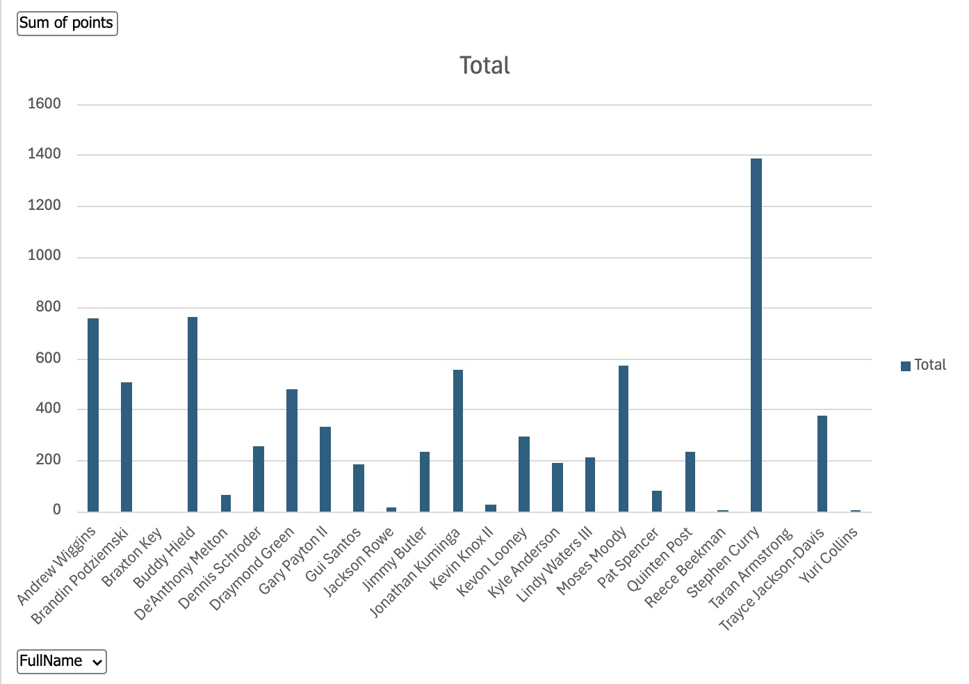 The histogram and pie chart clearly show the team's top scorers, with Stephen Curry leading at 1,384 points (18.4% of the total), followed by Buddy Hield (763), Andrew Wiggins (755), and Moses Moody (573). The line chart shows the team's scoring fluctuations, generally having a strong offensive performance with consistent 100+ point games. Though, occasional dips occur like the season-low 85 points on 1/20/2025. The highest-scoring game (140 points on 10/23/2024) reflects peak efficiency, while a late-season surge in February and March, featuring frequent 120+ point games, may suggest improvement. Players with minimal scoring, like Reece Beekman and Yuri Collins, likely serve defensive or bench roles. Overall, the team maintains stable offensive production with promising late-season momentum.
