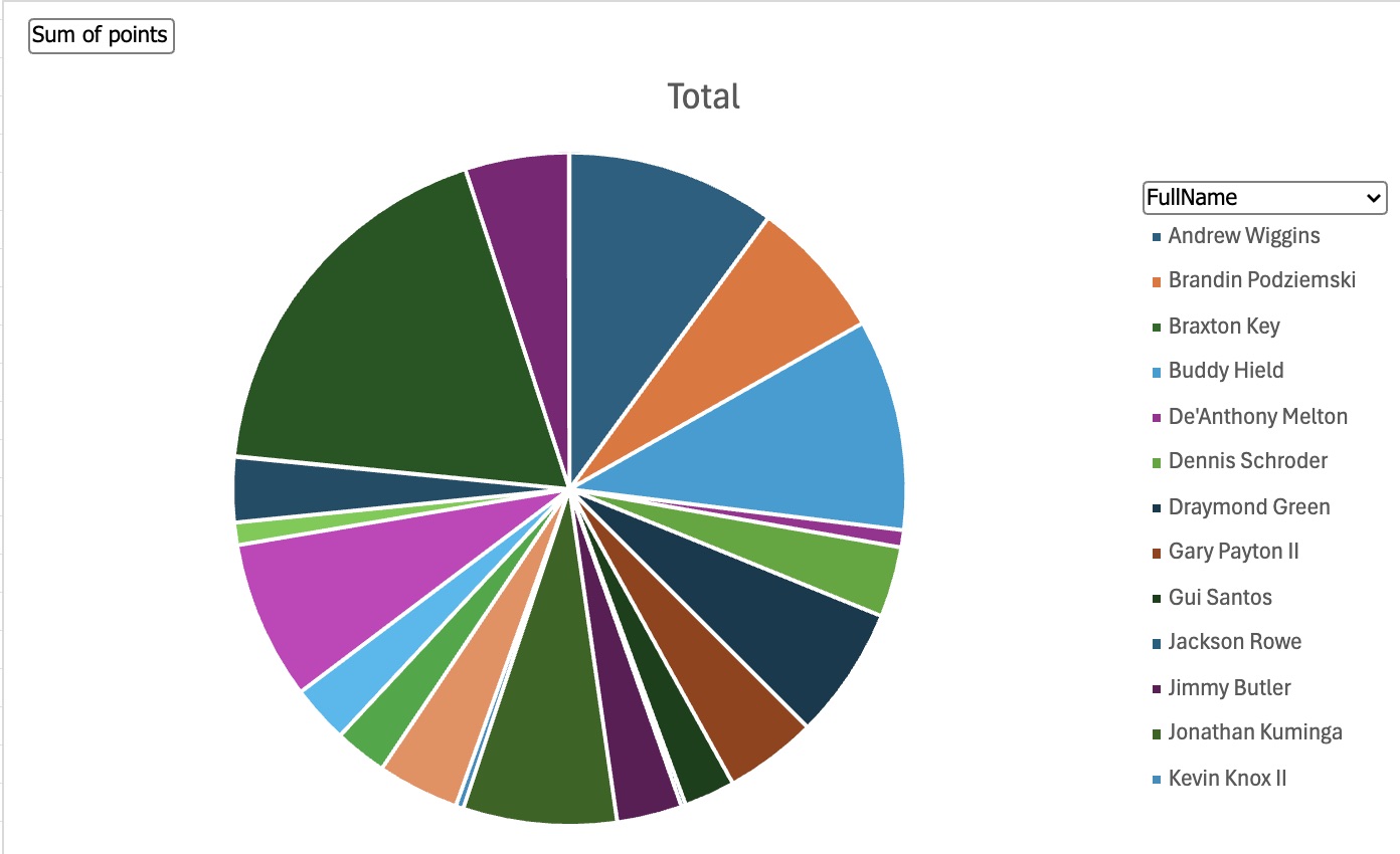 The histogram and pie chart clearly show the team's top scorers, with Stephen Curry leading at 1,384 points (18.4% of the total), followed by Buddy Hield (763), Andrew Wiggins (755), and Moses Moody (573). The line chart shows the team's scoring fluctuations, generally having a strong offensive performance with consistent 100+ point games. Though, occasional dips occur like the season-low 85 points on 1/20/2025. The highest-scoring game (140 points on 10/23/2024) reflects peak efficiency, while a late-season surge in February and March, featuring frequent 120+ point games, may suggest improvement. Players with minimal scoring, like Reece Beekman and Yuri Collins, likely serve defensive or bench roles. Overall, the team maintains stable offensive production with promising late-season momentum.